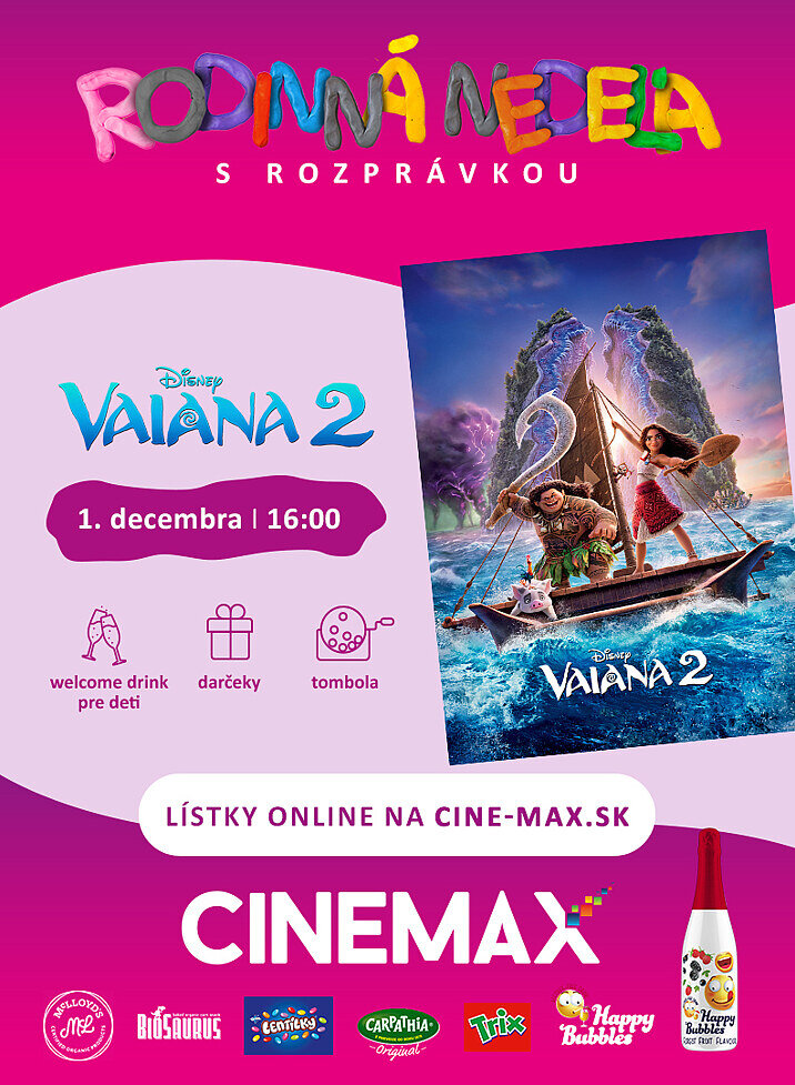 Odvážne dievča Vaiana nečakane dostane žiadosť o pomoc od svojich odvážnych predkov a spolu s Mauim a úplne novou posádkou sa vydáva na cestu naprieč moriami Oceánie do nebezpečných a dávno zabudnutých vôd, kde ju čaká dobrodružstvo plné nástrah, s ktorými sa ešte nikdy nestretla. Pokračovanie úspešného animovaného filmu Vaiana 2 prichádza do slovenských kín 28. novembra.